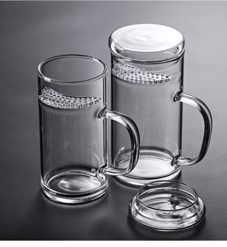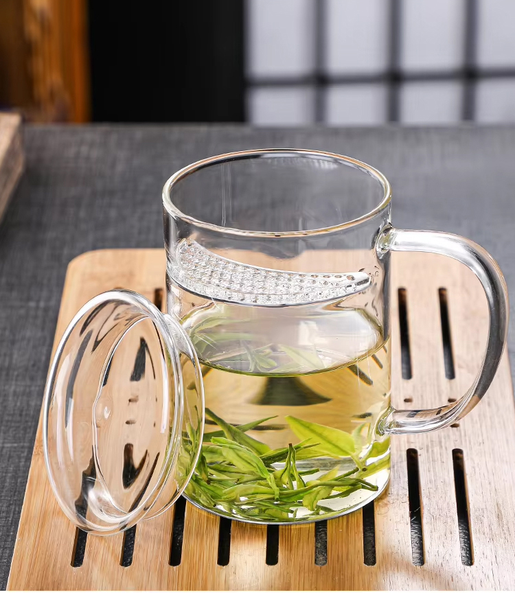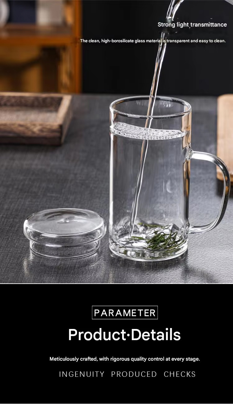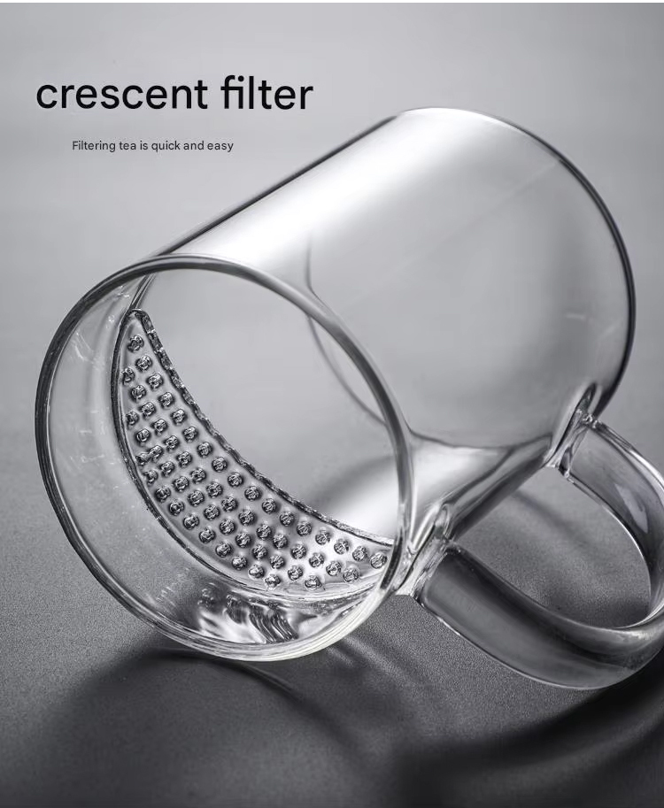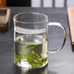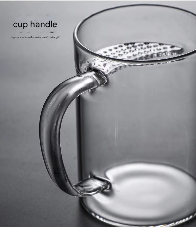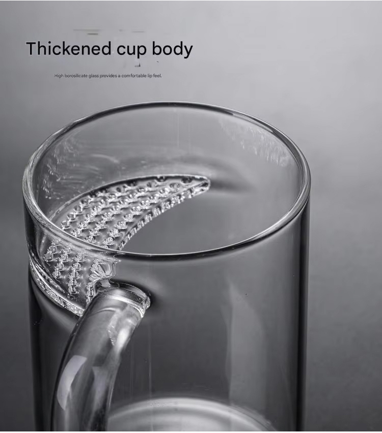 New Design Durable Transparent Heat Proof Clear Borosilicate Glass Tea Mug with Filter and Handle